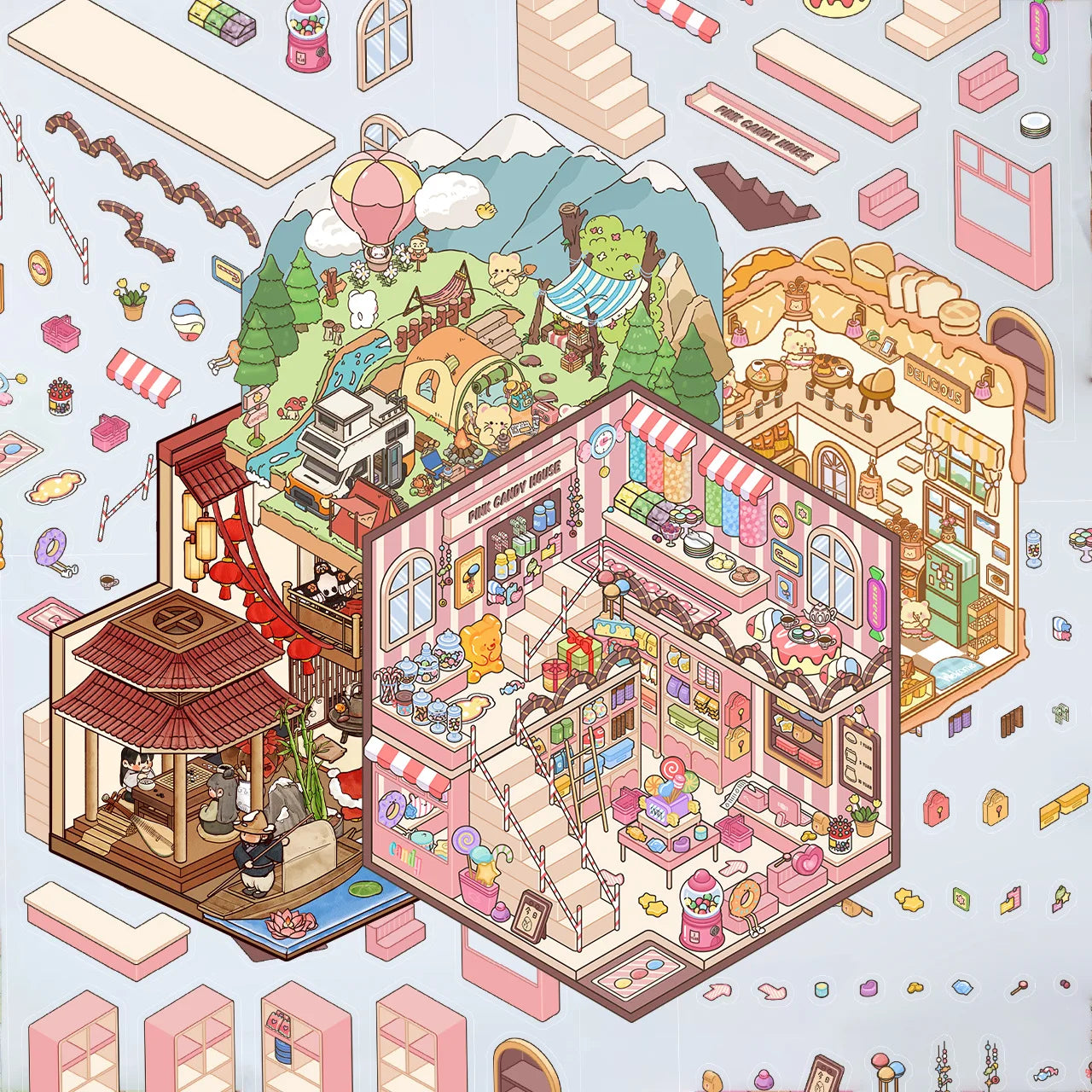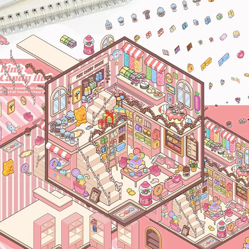 3D Cartoon Landscape Stickers Pink Candy House Miniature World 3D Small House Decompression DIY Scene Hand Account Stickers